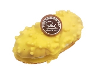 Familie van de traditionele slagroomsoes. Alleen langwerpig met gele room, bananen en slagroom. Herkenbaar aan de versiering van gele bananenchocolade met flinterdunne chocoladestrepen. Een kop koffie past hier goed bij.
