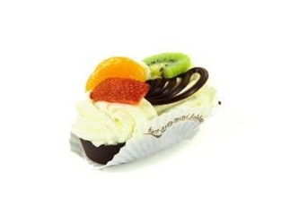 Een chocolade bakje gevuld met slagroom en afgewerkt met vers fruit en een chocolaatje.