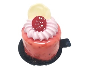 Vanille cakeje met witte chocolade bavarois en frambozen fruffi, afgewerkt met spiegel met crunch, aardbeien kookschuim en chocolade.