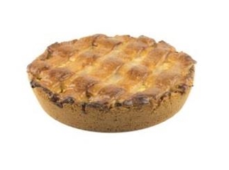De vers gebakken appeltaart is gemaakt van harde wenerdeeg met gele room, biscuit met daarop verse appel met rozijnen en een vleugje kaneel met opnieuw een raster van hard wenerdeeg.