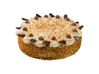 Hazelnootschuim taart heerlijk uit eigen bakkerij gevuld met volle slagroom en geheel afgewerkt met nootjes.