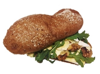 Bruine ciabatta belegd met rucola, plakken brie, walnoten en honing.
