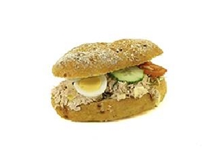 Milano broodje met slamix, huisgemaakte tonijnsalade, komkommer, tomaat en ei.