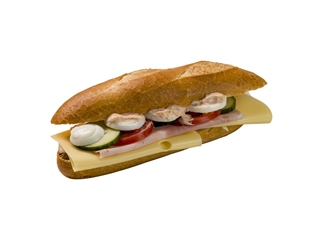 Huisgemaakte dressing, slamix, ham, kaas, komkommer, tomaat, ei op een pistolet.