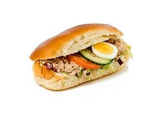 Zacht puntbroodje met slamix, huisgemaakte tonijnsalade, komkommer, tomaat en ei.