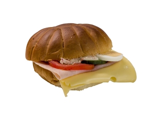 Huisgemaakte dressing, slamix, ham, kaas, komkommer, tomaat, ei op een zacht wit bolletje.